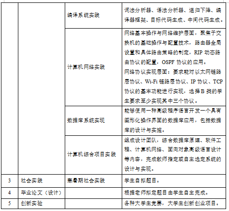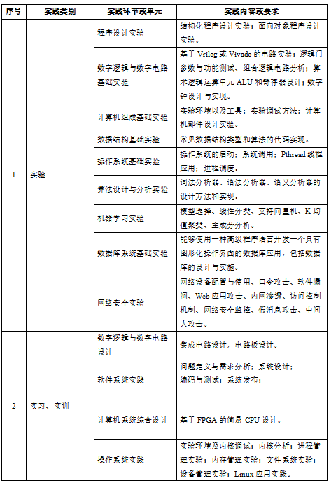 (2)分析和解决问题的能力:能够设计针对计算机领域复杂工程问题的解决方案,设计满足特定需求的软硬件系统、算法或模型,并能够在设计过程中体现创新意识,考虑社会、健康、安全、法律、文化以及环境等因素。在校期间应完成六个系统或其功能模块的设计与实现:一个简易CPU并通过FPGA方式进行实验 验证、一个操作系统功能模块、一个编译系统功能模块、一个数据库管理系统功能模块、一个嵌入式系统、一个应用软件系统。
