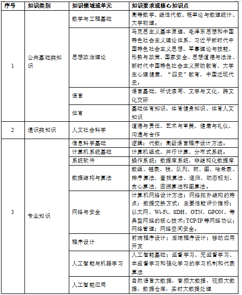(3)专业知识:具有人工智能的数学基础、信息科学基础知识,了解学科的知识结构、典型技术、核心概念和基本工作流程。具有计算机体系结构、计算理论、软件工程、人工智能、数据库系统、信息安全等领域的专业知识,并在某一方面有所侧重。