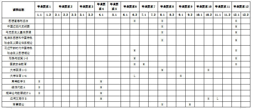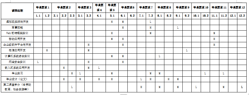 本专业课程及实践教学环节对毕业要求的支撑度(H、M、L)如下: