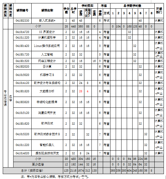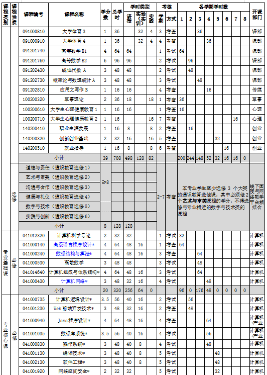 专业核心课程:高级语言程序设计、数据结构与算法、计算机网络、计算机组成与体系结构、计算机逻辑设计、Java程序设计、Web前端开发技术、数据库系统、操作系统、编译技术、软件工程、嵌入式系统、网络空间安全等。
