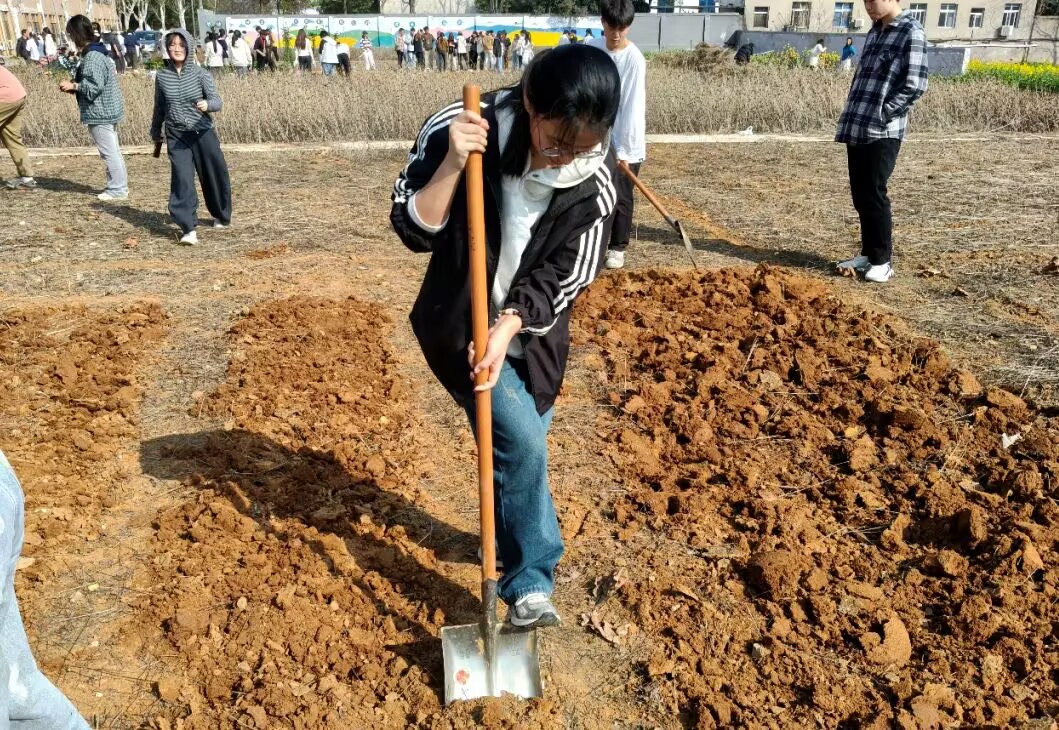 之后,同学们也纷纷开始挥动手臂,额角沁着汗珠却眼神专注,铁锹切入泥土的“沙沙”声,是青春与土地对话的韵律。