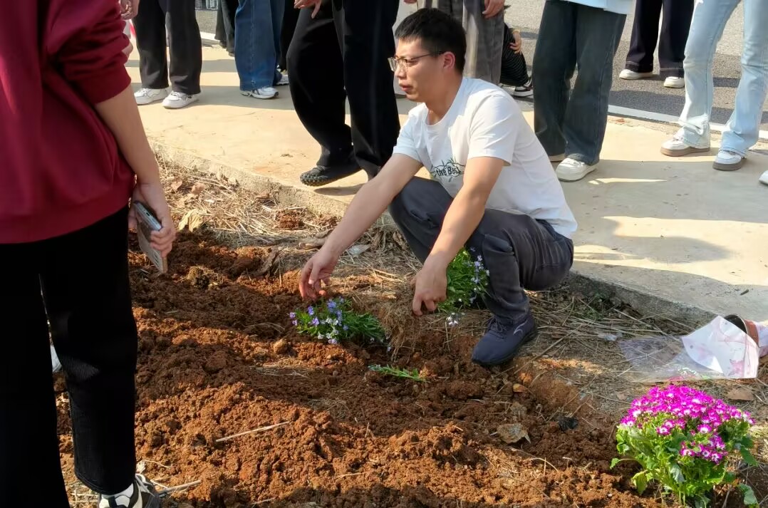 当铲土结束,开始种植时;余老师蹲下身,手把手教同学们栽种花苗。大家小心翼翼地将花苗放入坑中,扶直、填土、轻压,每一个动作都饱含对生命的敬畏。