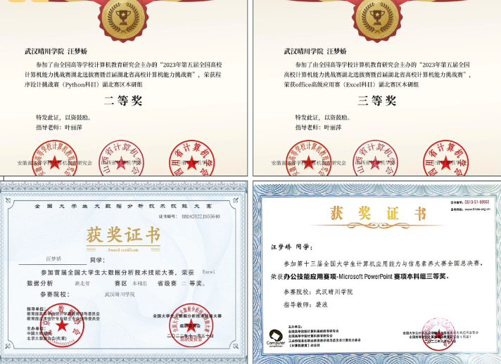经历:曾荣获蓝桥杯全国软件和信息技术专业人才大赛湖北赛区软件测试大学组一等奖、获全国高校计算机能力挑战赛Python湖北赛区本研组二等奖、全国高校计算机能力与数字素养全国赛区本研组二等奖等奖、教师资格证等。