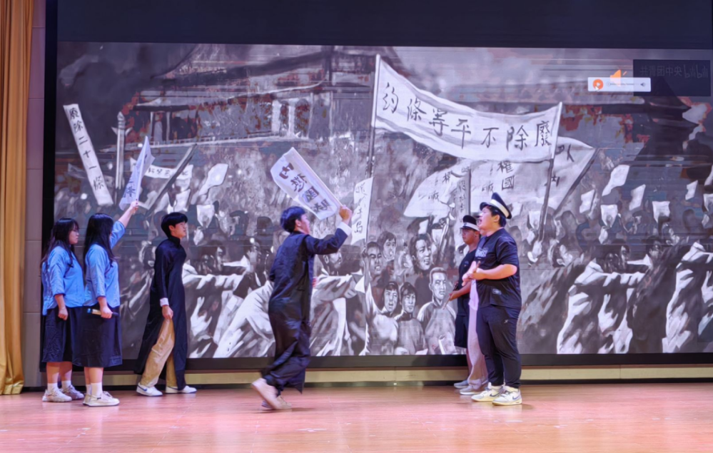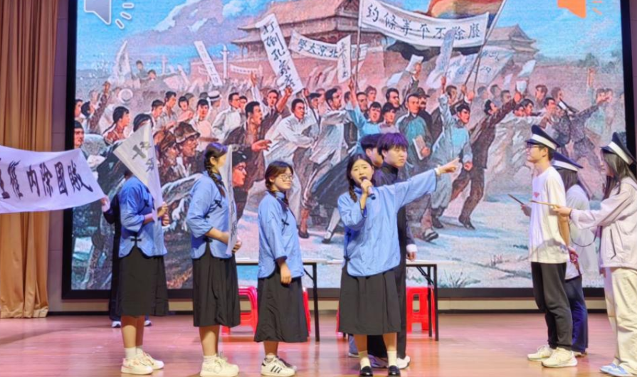 杨雨辰同学带领的小组为我们带来了五四运动的情景再演绎。同学们的演绎真实而富有激情,他们高呼“外争主权!内除国贼!誓死力争还我青岛!”,将五四精神的火种作为精神,传承给了我们。赓续红色血脉,谱写青春华章。