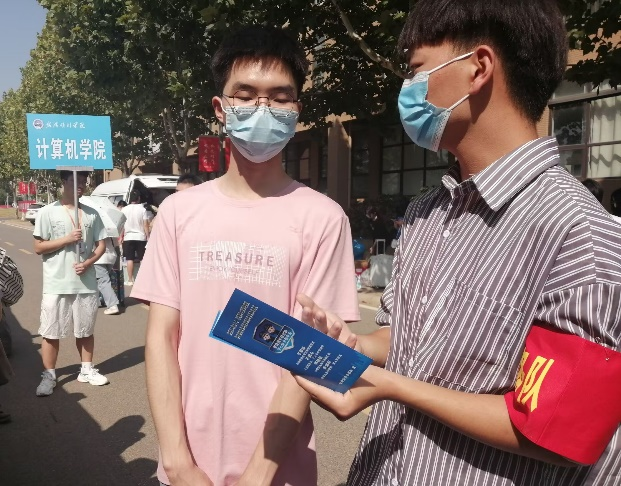 9月17日及18日报道期间,第一党支部学生党员统一佩带袖章,将“党员红”化身“志愿红”。她们在烈日炎炎下却始终保持着热情,协同志愿者们一起,积极帮助新大一学生搬运行李,同时仔细回答新生所提出的问题,并向新生宣传反诈知识,提醒他们注意保护好自己的金钱,避免遭受损失。