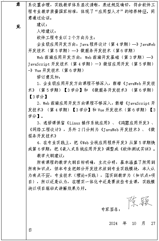 专家评审意见: 1.本专业定位于植根武汉,面向湖北省战略性新兴产业和中小型企业,服务于区域经济,人才培养方案凸显了人工智能技术,注重人工智能技术开发、应用和神经网络,契合市场需求。 2.本专业人才培养规格中,对知识、能力、素质的要求符合高等学校本科专业教学质量国家标准,专业课程模块划分和知识体系结构合理,方向特色明显。 3.本专业依据应用型本科教育特征,构建了基本技能训练、专业综合训练、企业实战训练“三层次”实践教学体系,推行了项目化教学,形成学用创相融的实践载体,分别采用了线上线下混合式和校企联合的教学方法模式,创新了教学手段和方法。 4.本专业方向人才培养方案基于成果导向OBE教育理念,建立了培养目标与毕业要求之间的对应关系,体现了“一体化设计”的教学改革基本思想,专业教学进程安排合理,周学时安排均衡,考核方法科学,符合教学规律。 评审总结:本专业人才培养方案定位准确,目标明确,课程体系设置合理,实践教学体系层次清晰,表述规范确切,符合人工智能专业教学质量国家标准,体现了“应用型人才”的培养特征。同意通过论证。 建议: 人培建议: 必修课:Python程序设计(第2学期)--》人工智能(第3学期)--》计算机视觉(第4学期)+ 自然语言处理(第4学期)--》深度学习(第5学期)--》机器学习(第6学期) 修订意见如: 1、把《语音信息处理》换成《深度学习》课程(2.5学分),放在第5学期,主要是讲述神经网络等技术,为后续机器学习课程做铺垫。 2、把所有选修课替换成AI大模型方向,主要目标是基于AI大模型的场景化应用。 AI大模型原理与实践(第4学期)【3学分】--》AI大模型在自然语言处理中的应用(第5学期)【3学分】+AI大模型在计算机视觉中的应用(第5学期)【3学分】--》AI大模型的优化与部署(第6学期)【2学分】 3、在专业实践上,把《智能语音处理综合实践》换成《深度学习综合实战》,从第6学期换成第5学期。 教学大纲建议: 所有课程的教学大纲目标明确,主次分明,基本涵盖了所用到所有知识点。 新增AI大模型课程方向课程描述: 1.《AI大模型原理与实践》:这门课程将深入剖析AI大模型的原理、架构和训练方法。学生将学习如何设计和构建大规模神经网络,包括模型的选择、超参数调整、优化器选择等。同时,课程还将介绍大模型的训练技巧、分布式训练以及如何处理大规模数据集。学生将通过实践项目来应用所学知识,包括使用大模型进行图像分类、目标检测、语音识别等任务。 2.《AI大模型在自然语言处理中的应用》:这门课程将重点探讨AI大模型在自然语言处理(NLP)领域的应用。学生将学习如何使用预训练的大模型(如BERT、GPT等)进行文本分类、情感分析、问答系统、机器翻译等NLP任务。课程还将介绍如何对大模型进行微调以适应特定的NLP任务,并探索如何在大模型上进行创新和改进。 3.《AI大模型在计算机视觉中的应用》:这门课程将专注于AI大模型在计算机视觉领域的应用。学生将学习如何使用大规模卷积神经网络(CNN)进行图像分类、目标检测、图像分割等任务。课程还将探讨如何使用大模型进行图像生成、图像翻译、视频分析等高级任务。学生将通过实践项目来应用所学知识,并了解如何在大规模数据集上进行模型的训练和评估。 4.《AI大模型的优化与部署》:这门课程将介绍如何优化和部署AI大模型。学生将学习如何对大模型进行性能优化,包括模型压缩、剪枝、量化等技术,以减少模型的计算量和存储需求。同时,课程还将介绍如何将大模型部署到实际应用中,包括模型的集成、推理加速、实时推理等技术。学生将通过实践项目来应用所学知识,将大模型部署到实际应用场景中。 这些课程将提供对AI大模型应用的深入理解和实践经验,帮助学生掌握大模型在各个领域的应用技巧和方法。通过实践项目和案例分析,学生将能够更好地理解AI大模型的应用价值和发展趋势。 专家签名: 2024 年 10 月 27 日 |